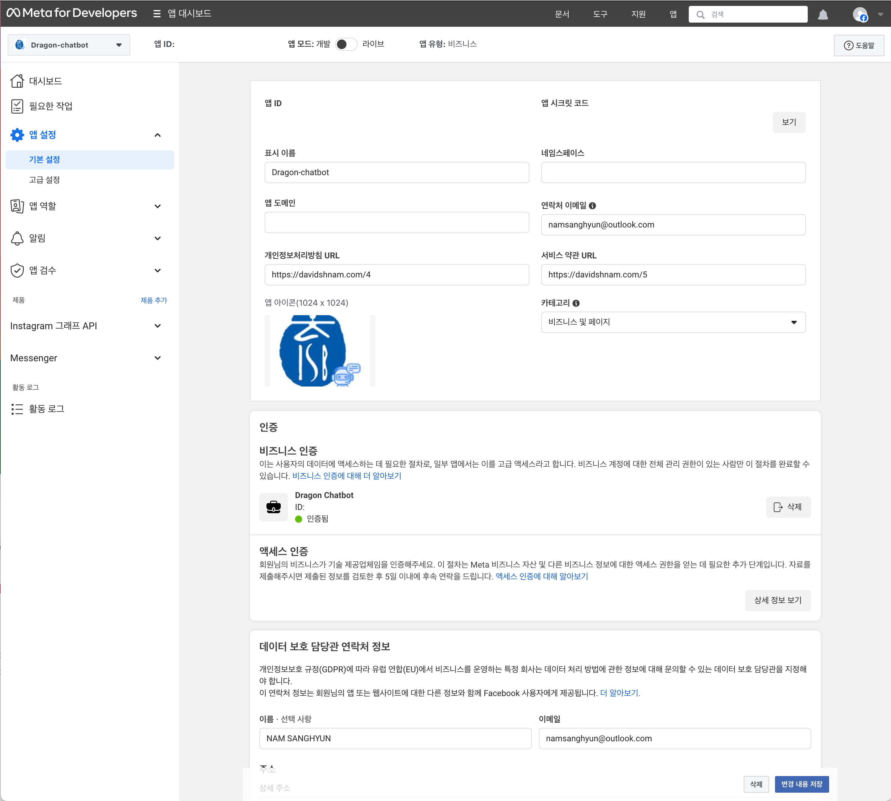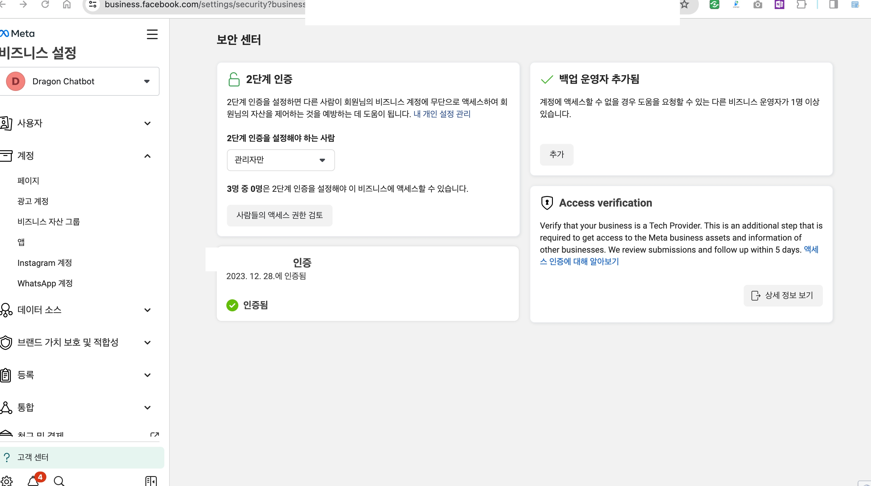 이 API를 사용하기 위해 페이스북 비지니스 인증을 받아야 한다.