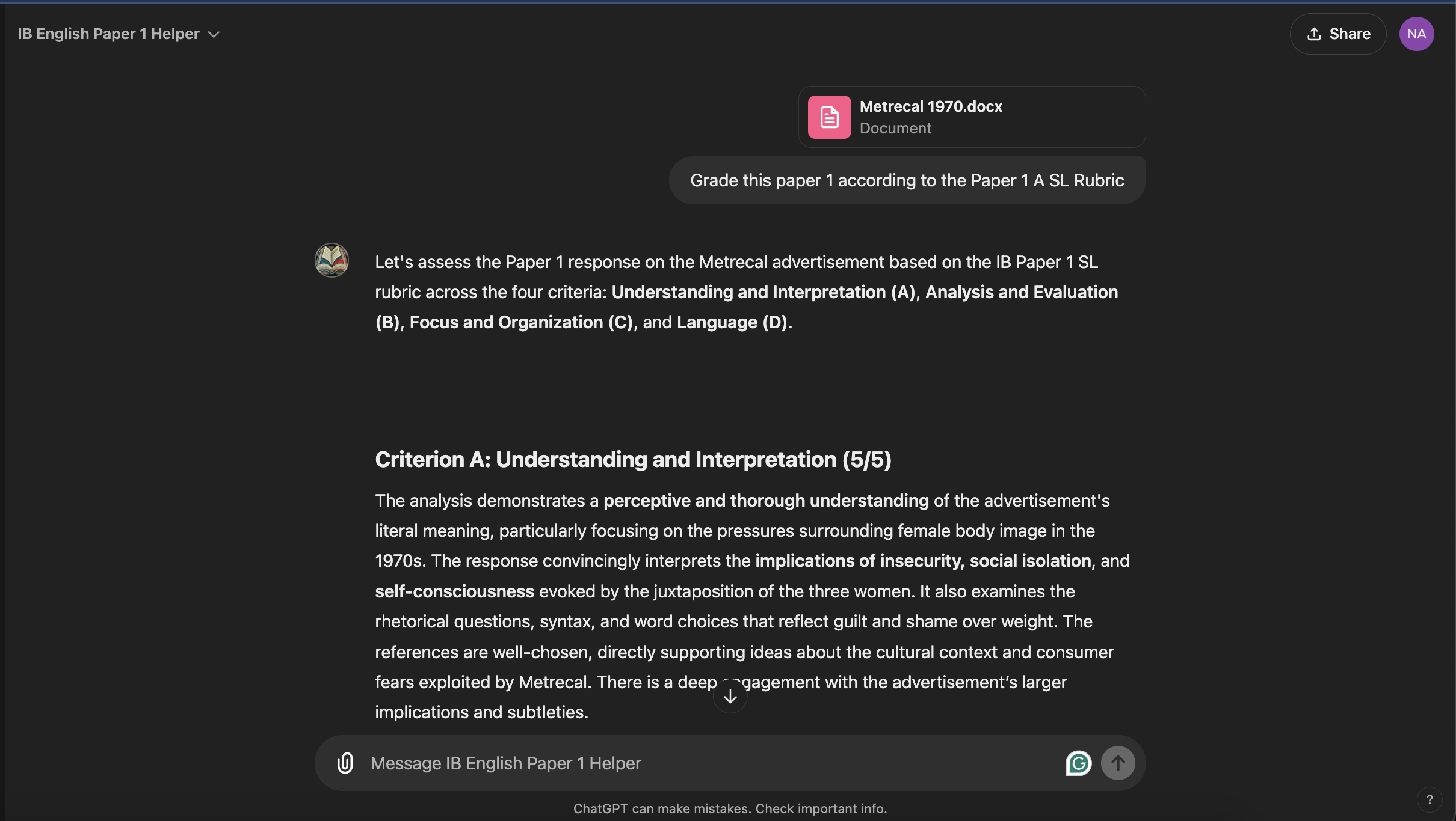 With the rise of artificial intelligence (AI), I wanted to explore a modern approach to addressing this challenge. I noticed that ChatGPT was becoming an increasingly popular tool, used not only by students but also by teachers. This inspired me to create a custom GPT tool designed specifically to help IB English A SL students improve their performance on Paper 1, which focuses on guided textual analysis.