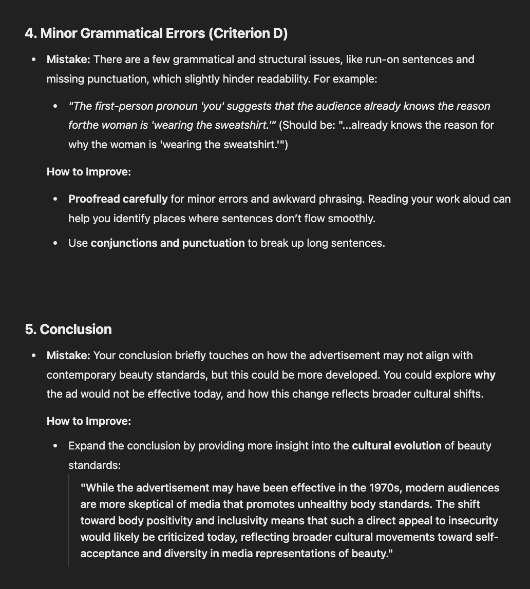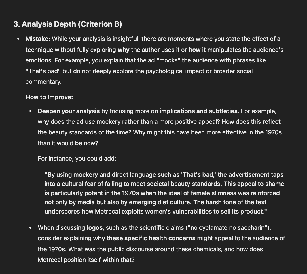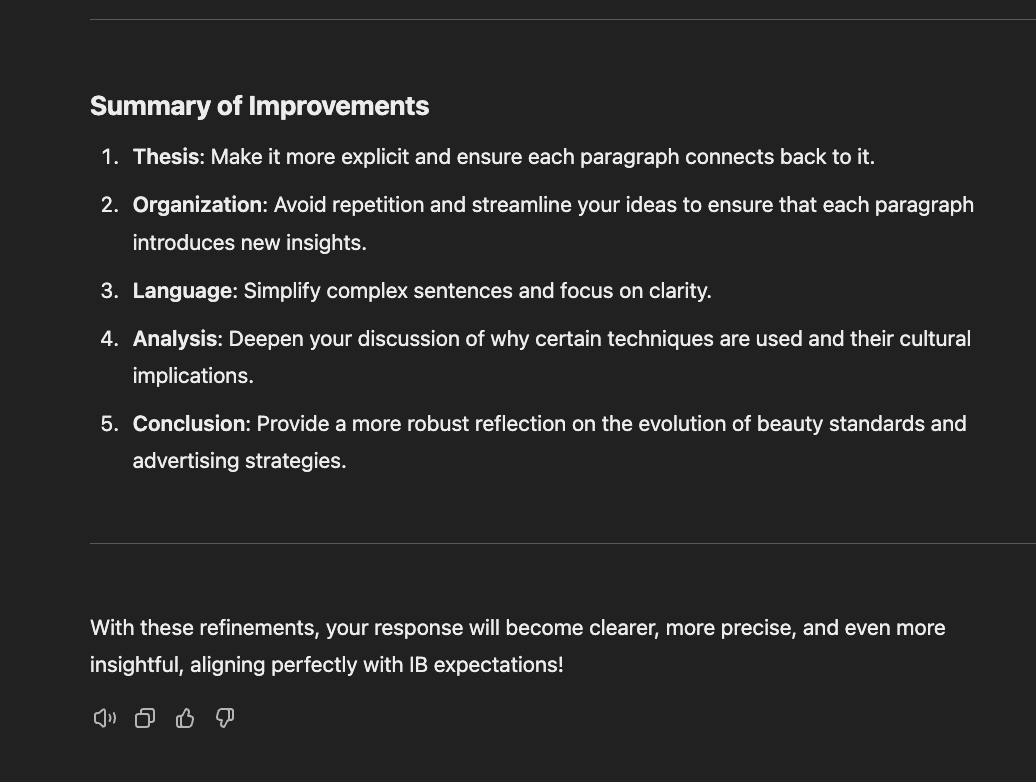 One of my main concerns when developing this tool was ensuring the ethical use of ChatGPT. One of the most controversial issues surrounding AI is its potential to undermine students' critical thinking, leading to over-reliance on the tool for essays and assessments. To address this, I designed the GPT so that it does not provide ready-made analyses or inferences unless the user first uploads their own essay for review. This way, the GPT acts as a supportive guide, encouraging critical thinking rather than replacing it.
