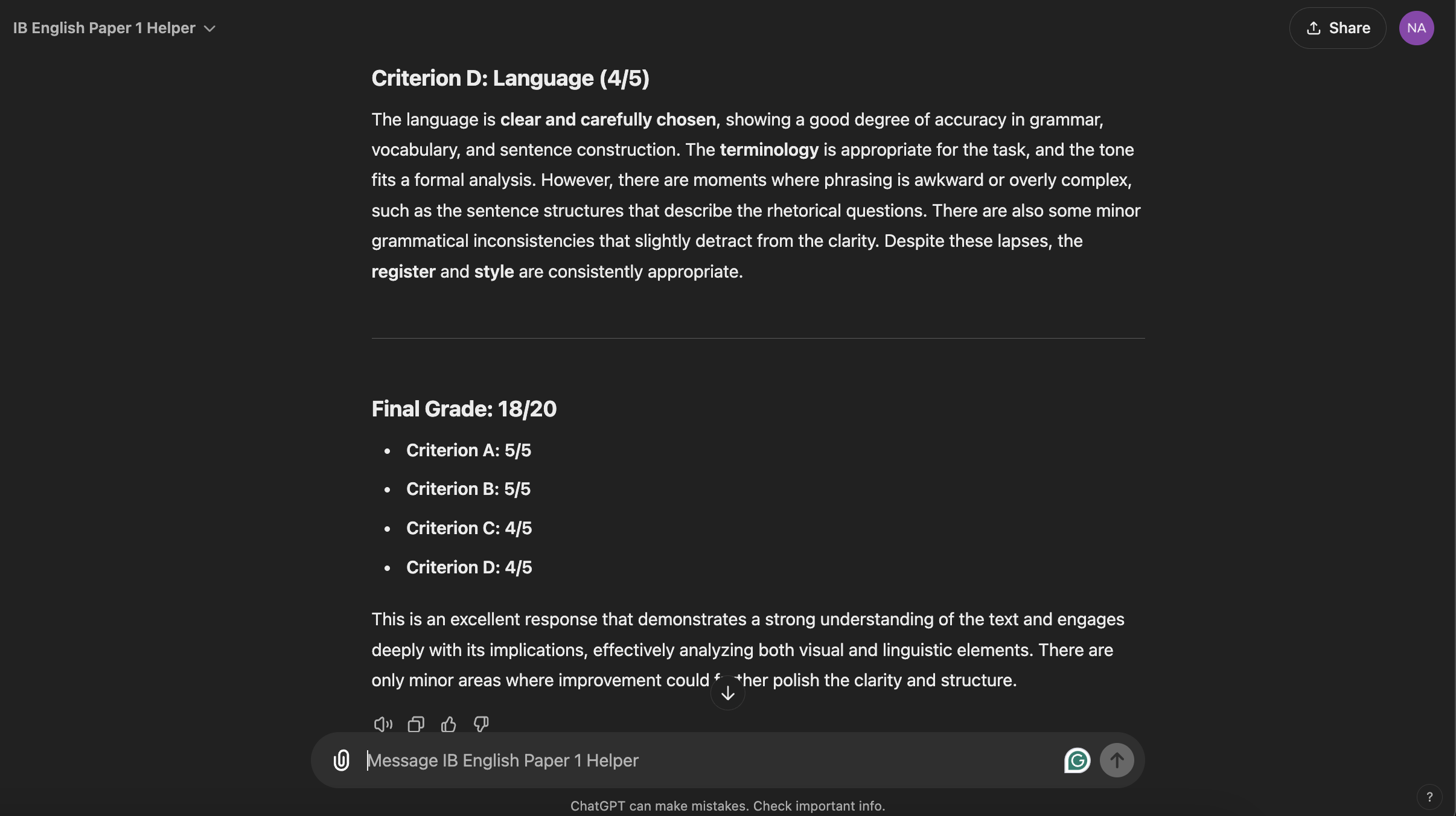 I developed the IB English Paper 1 Helper, a GPT designed to assist IB English A SL students with their Paper 1 exam preparation. The tool reviews students’ written analyses of unseen texts, evaluating key textual features such as language, structure, tone, and style. It also assesses how well students explore the deeper implications of the passage, offering feedback based on the official IB Paper 1 rubric. This includes detailed suggestions for improvement in areas such as understanding, interpretation, analysis, organization, and language use. By offering tailored feedback, the GPT helps students refine their essays, making them more insightful, focused, and well-structured. The ultimate goal is to guide students toward achieving higher scores ethically on their Paper 1 exams.