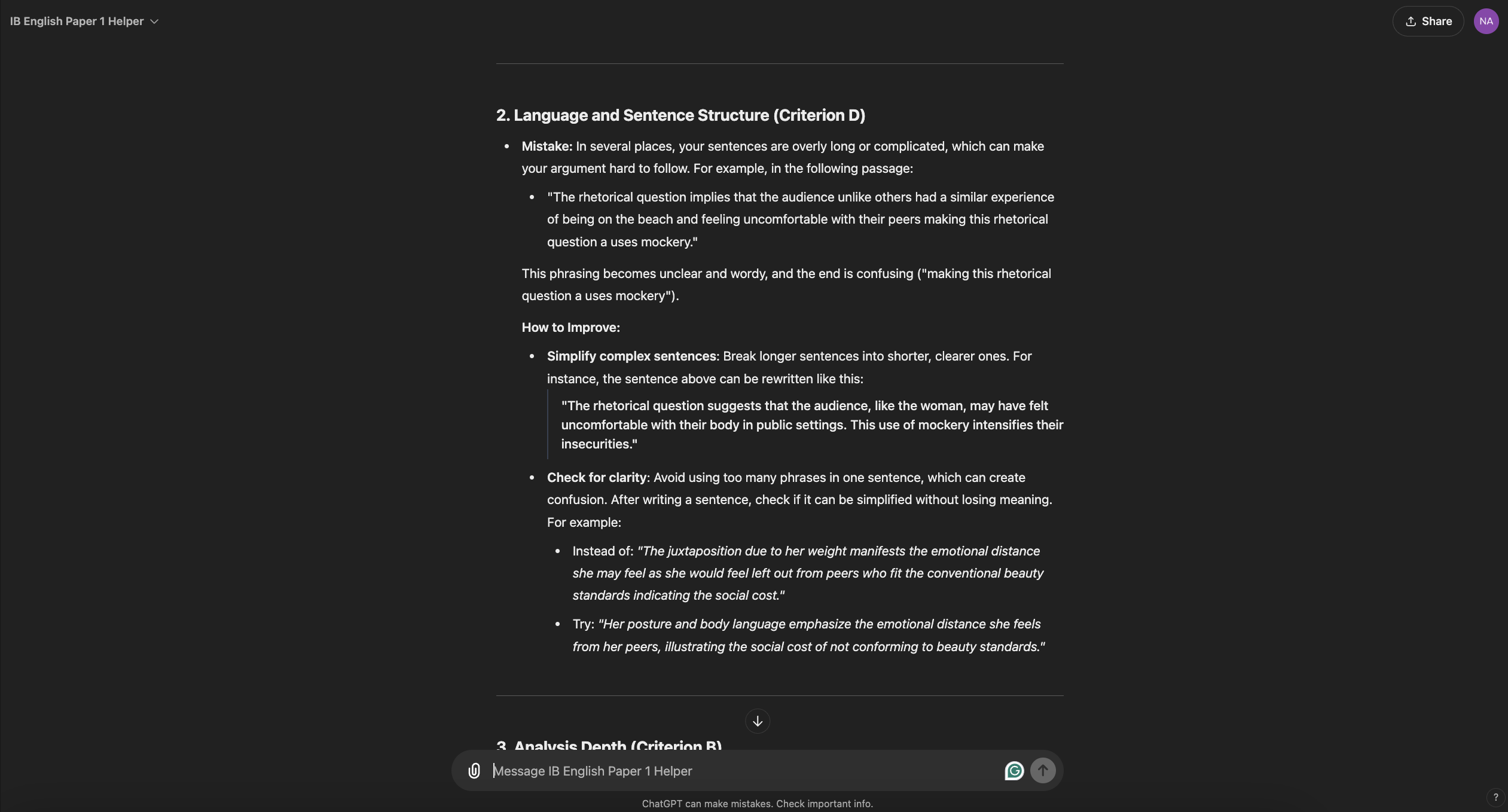 I developed the IB English Paper 1 Helper, a GPT designed to assist IB English A SL students with their Paper 1 exam preparation. The tool reviews students’ written analyses of unseen texts, evaluating key textual features such as language, structure, tone, and style. It also assesses how well students explore the deeper implications of the passage, offering feedback based on the official IB Paper 1 rubric. This includes detailed suggestions for improvement in areas such as understanding, interpretation, analysis, organization, and language use. By offering tailored feedback, the GPT helps students refine their essays, making them more insightful, focused, and well-structured. The ultimate goal is to guide students toward achieving higher scores ethically on their Paper 1 exams.