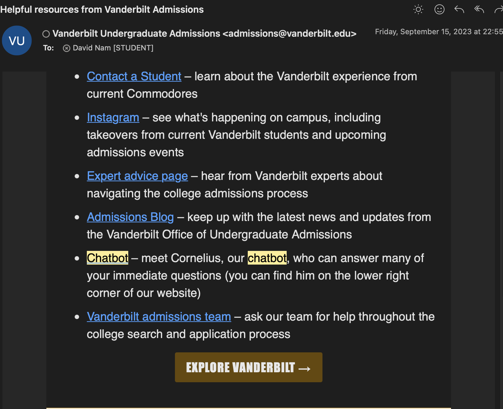 As the development of our dragon-themed chatbot nears completion, I find myself reflecting on the genesis of this project. The spark of inspiration struck me at the close of my tenth-grade year. During that formative period, I was immersed in an introductory programming course—a choice that wasn't part of the core curriculum but one that ignited an enduring flame. Programming swiftly transcended from an academic pursuit to my fervent passion, shaping my aspirations for university studies. This warmhearted passion motivated me to ponder, "How can I strengthen my programming skills but, at the same time, utilize programming to make positive changes to this school?" While I was wondering, I received an email from Vanderbilt University. Then, I saw one of its website's features: "Chatbot: Cornelius."