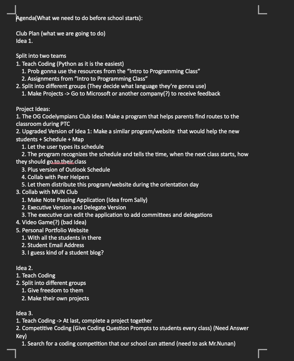 Codelympians is a club that was rebuilt and renewed this year; It was founded by my friend Matthew. Due to the COVID-19 pandemic, this club was inactive for a few years. Initially, as no one wanted to start his club again, it would remain inactive for the following few years. However, my passion for programming motivated me to take responsibility for reviving Codelympians. This club is mainly targeted at programming beginners and advanced programmers. Matthew and I decided that we should teach PyThon language to beginners and provide freedom to advanced programmers to code their own desirable programming projects. This was our proposal and planning document that our supervisor approved, the head of ICT, Mr. Nunan: