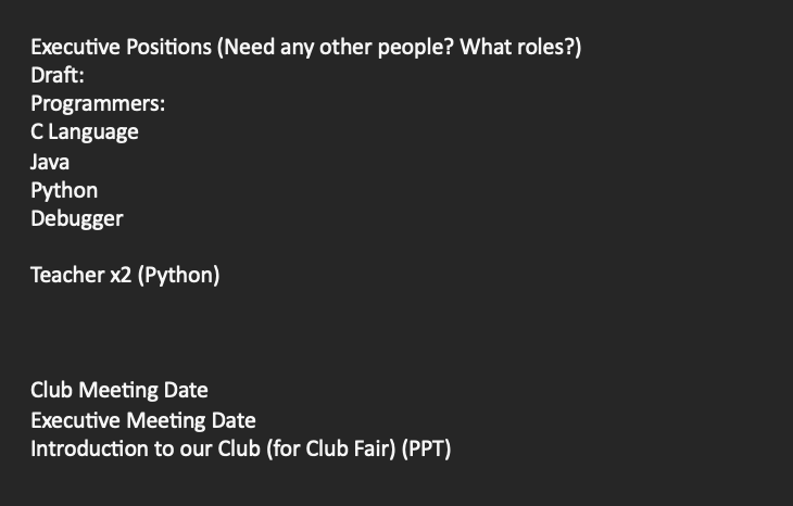 Furthermore, talking about the actual meeting with the club members, I felt proud that our first meeting was timely, well-managed, and successful. The feeling of responsibility strengthened, looking at how everyone was sitting and staring at me talking over the PowerPoint. As the club meeting went successfully, I look forward to the following club meetings, and the output or coding projects, more speicifically, this team can produce.