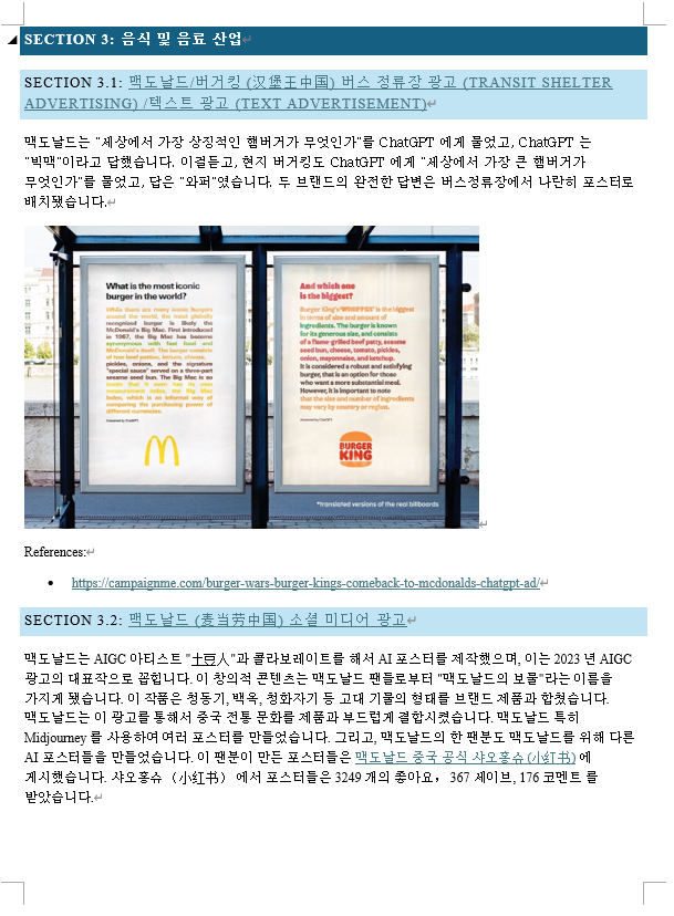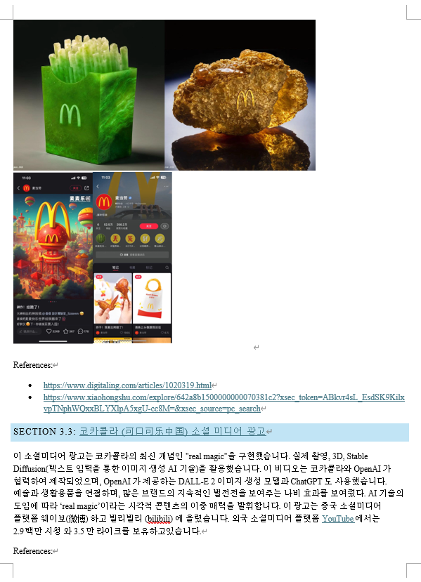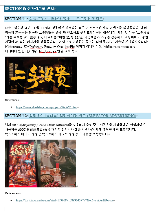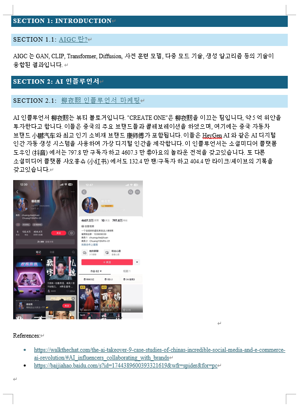 My responsibilities during the internship included conducting research on successful use cases of AI-generated content, particularly from large enterprises in China. I completed two formal reports—one in Chinese for internal distribution within the company and another in Korean. These reports, titled "AIGC Advertisement Research _ 2024.6.5" and "AI Contents 2," detailed my findings and provided insights into how AI-generated content is reshaping the advertising landscape.